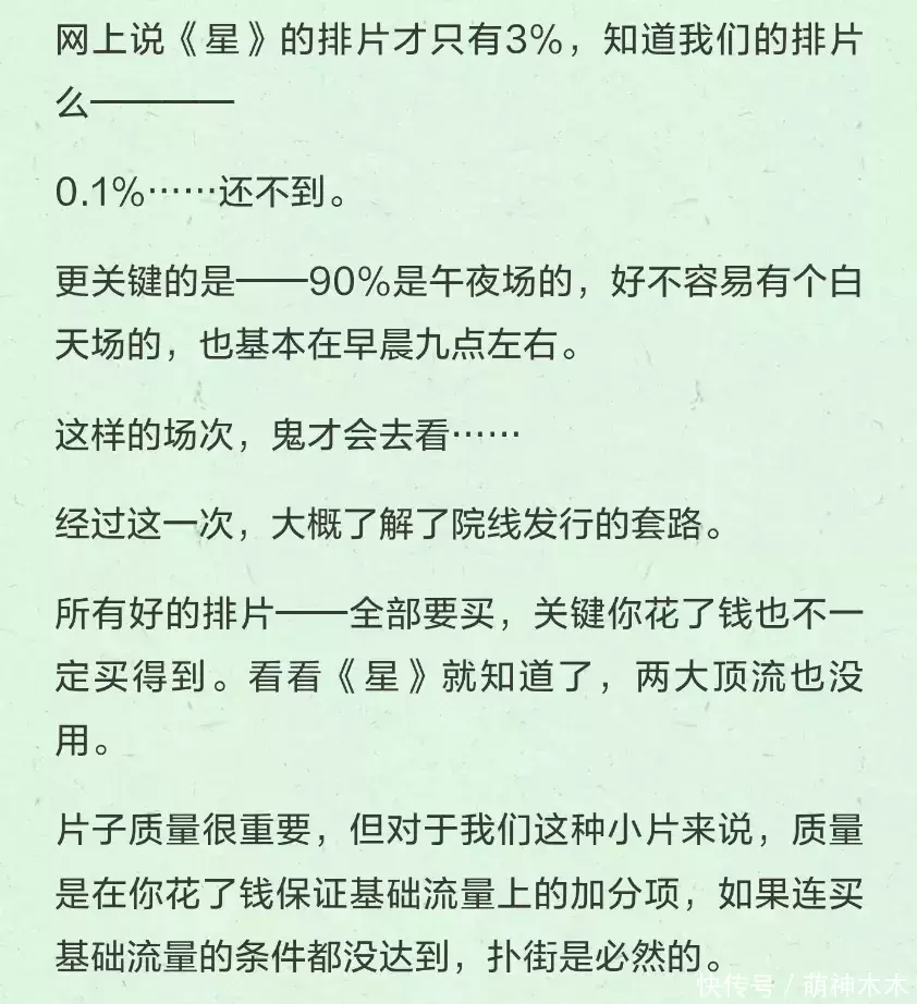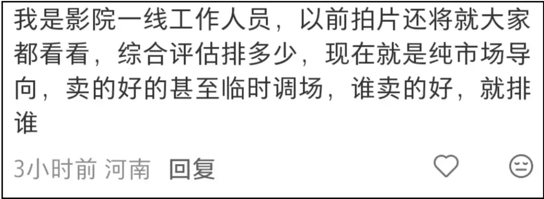 这里且不提花钱买排片一事是否合理,就看其他业内跟着爆料,提到以前排片还会综合评估,争取每部电影都有机会,如今排片纯市场导向,谁卖的好,就排谁的。
