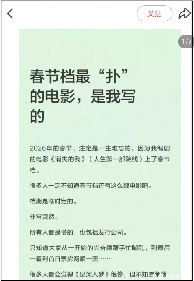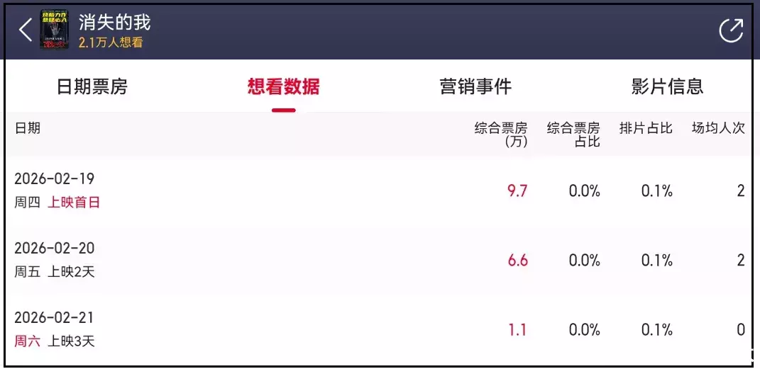 空降春节档、日票房排名20,排片占比0.1%,票房占比小于0.1%,场均人次0.5、上座率0.4%——以上数据放到冷门档期都是扑街中的扑街,竟然出现在了2026年春节档,连《消失的我》编剧本人都觉得离谱,主动发声透露了春节档电影内幕。