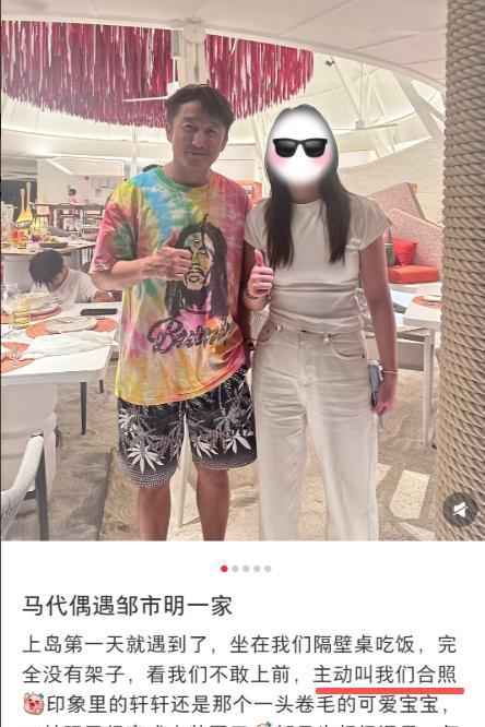他穿了件花里胡哨的短袖T恤,配着海岛风的短裤,浑身都是度假的松弛感,身后还能看到二儿子邹明皓的身影,安安静静站在旁边,看着挺乖巧。