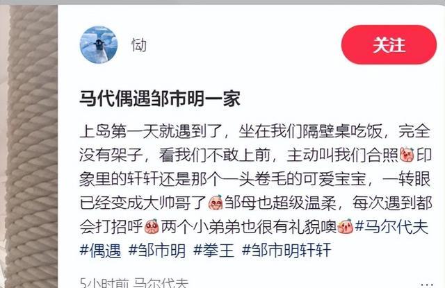 2月28日,有网友在马尔代夫偶遇到了邹市明一家来度假,看着别提有多温馨了。