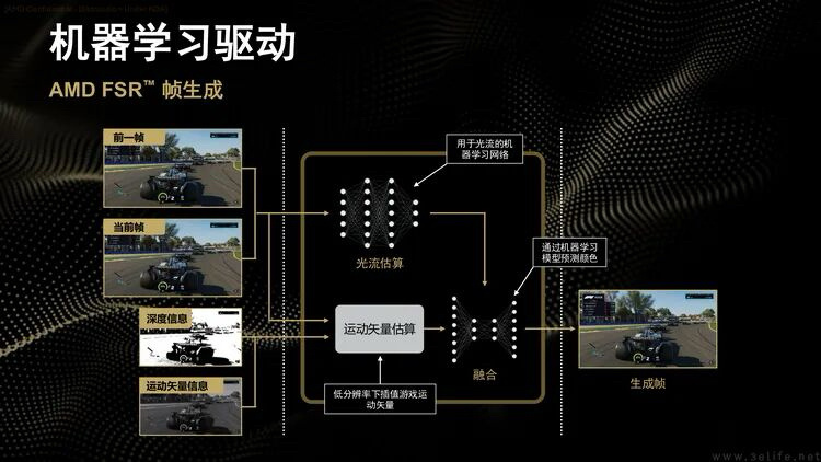 我们先来看看ML Frame Generation(机器学习帧生成)。与此前已经落地的ML Upscaling(机器学习超分辨率)、也就是与FSR4一样,它也依赖新的RDNA4 GPU,但同样不需要游戏做新的适配改造。只要是能够兼容之前FSR 3.1帧生成功能的游戏,就可以在驱动控制面板里打开相应开关,让RDNA4显卡“改用”机器学习技术来处理FSR3.1的帧生成需求,从而实现更高的帧预测画面精度,有效改善帧生成开启之后“中间帧”的画质。
