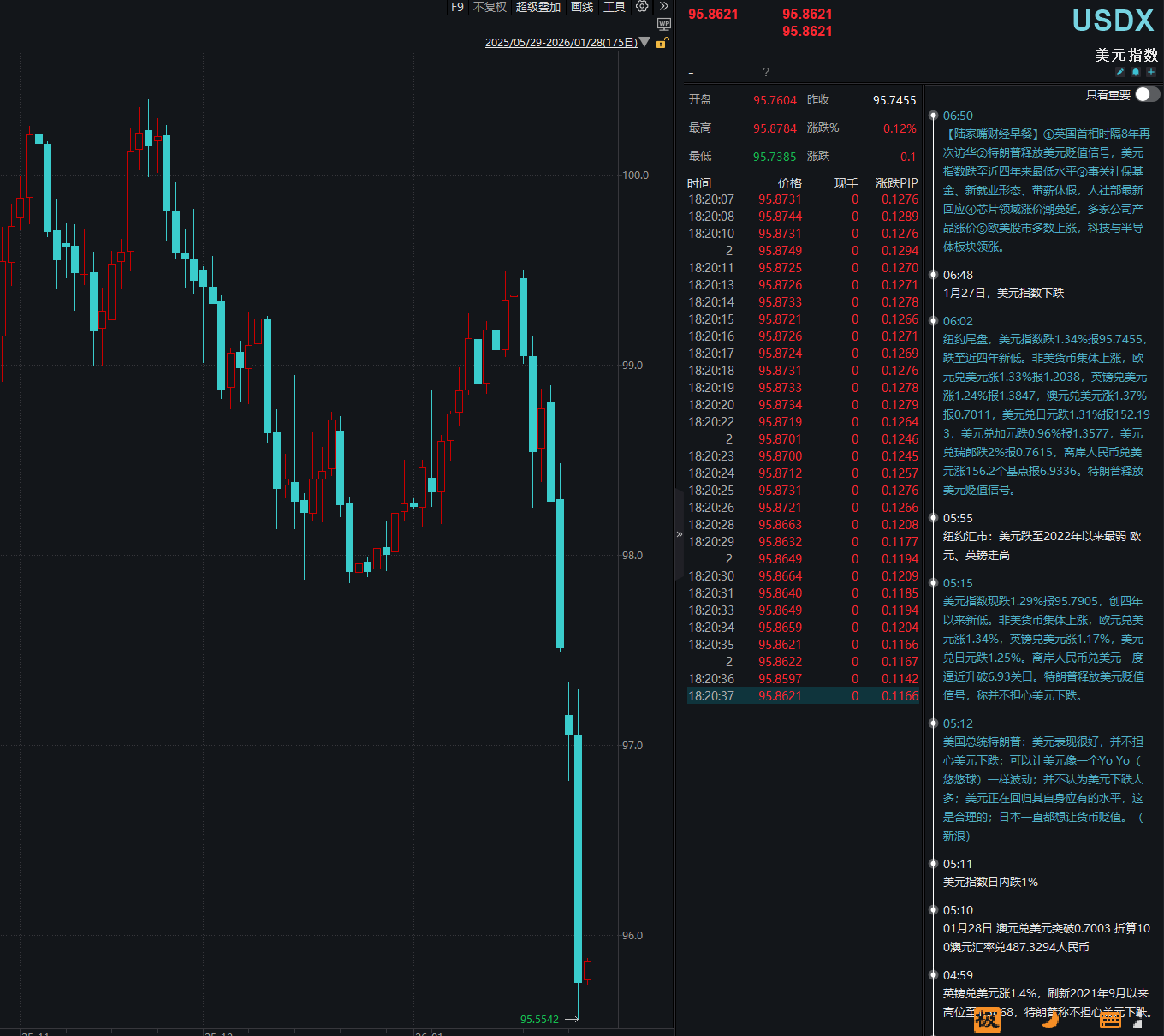 【大河财立方消息】1月27日晚间,美元指数大跳水,一度跌至95.5542,创2022年2月以来最低。