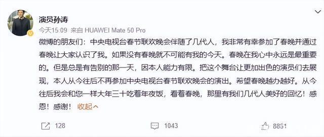 在孙涛对闫学晶事件做出澄清之后,1月26日,孙涛在个人账号正式发文宣布告别春晚。 孙涛发文称自己正式告别春晚,退出春晚舞台,把宝贵的舞台让给更优秀的年轻创作者们。 孙涛:中央电视台春节联欢晚会伴随着几代人,我非常有幸参加了春晚并且通过春晚大家认识了我。 如果没有春晚,就没有我的今天。春晚在我的心中永远那么重要,但总有告别的那一天。 因本人能力有限,把舞台让给更加出色的演员们去发现,本人今后不再参加中央电视台春节联欢晚会的演出。希望春晚越办越好。 从今往后,我和您一样在大年三十吃着年夜饭,看着春晚,那里有我们几代人的美好回忆,感恩!感谢。 对于自己不再上春晚,孙涛给出了朴实真诚的解释! 一方面他形容自己能力有限,另一方面他想把宝贵的舞台让给年轻创作者们,希望春晚越办越好。 说实话,其实孙涛不用出面解释,他就算是悄悄的退出大家也能接受。 但他出面给出说明,强调自己的立场与定位,这已经很好了。 网友:春晚少了你,就像过年少了鞭炮,不过健康最重要,希望未来能在其他地方见到你的身影! 和秦海璐的小品,反复看了很多遍。 我骄傲,我兴奋,你保安的舞台形象深入人心,青春的春晚记忆里,你永远是不可或缺的一份子! 早在此前他在解释闫学晶事件的时候,就形容自己已经有4年没有上春晚了,并且2026年也没有合适的作品,所以没有所谓的春晚秘密排练。 26日,他发文告别春晚的舞台,他表示自己内心里还是触动很大,不过这一点大家都非常理解。 要知道孙涛先后一共有18次登上春晚,他说自己能力有限,其实是谦虚的说法啦。 这显然不是他能力不足,而是他是时候退出了。58岁了,他也到了要告别舞台的时候了。 当然也有一些网友形容他周旋于营销号,前面闫学晶事件让他受伤了,他深陷谣言、家人被非议、所以他也累了,退出舞台,就是想给自己更多享受生活的可能性。 大家印象之中的孙涛是怎么样子的?舞台上他演的保安、小人物角色,大家还有印象吧。 生活之中,他如今算是憨憨的跟大家鞠了一躬,似乎是在说我就陪你们到这儿了,感谢大家一路的陪伴,未来,就交给年轻人吧。 在这个大家都争抢流量发声的时代,孙涛这个大家的“老熟人”宣布告别春晚舞台,尊重他,希望他越来越好。 老人不退出,新人上不来,这句话说的太对了。 护住家人,过自己想要的生活,轻松一点,和大家一样在大年三十吃团圆饭,真好。